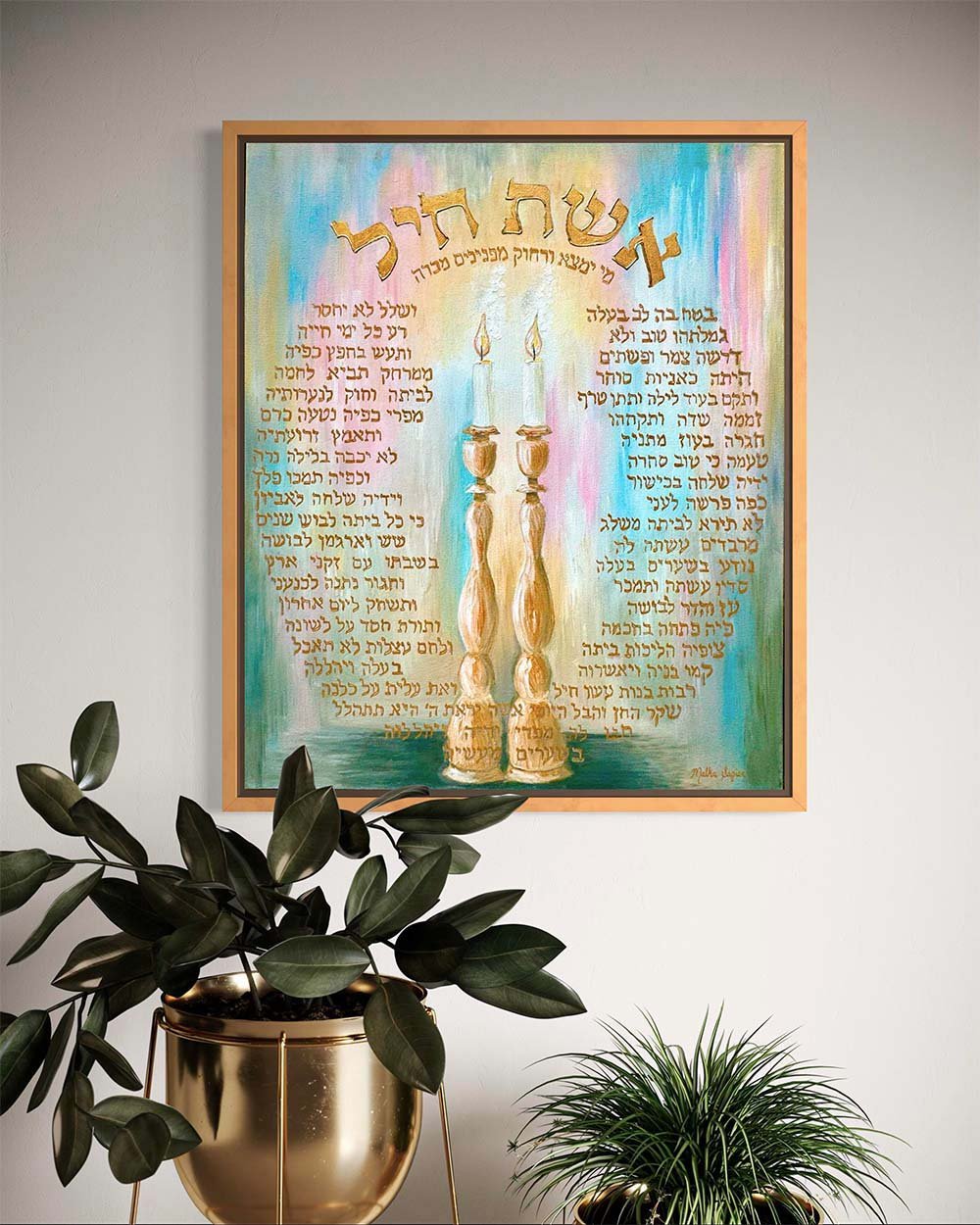 Glowing Shabbat candles illuminate a home framed by the words of Eshes Chayil. The painting invites the viewer to feel the warmth, peace, and strength that a Jewish woman brings into her family. It conveys that her light is both gentle and powerful, shaping a home filled with bracha and holiness.