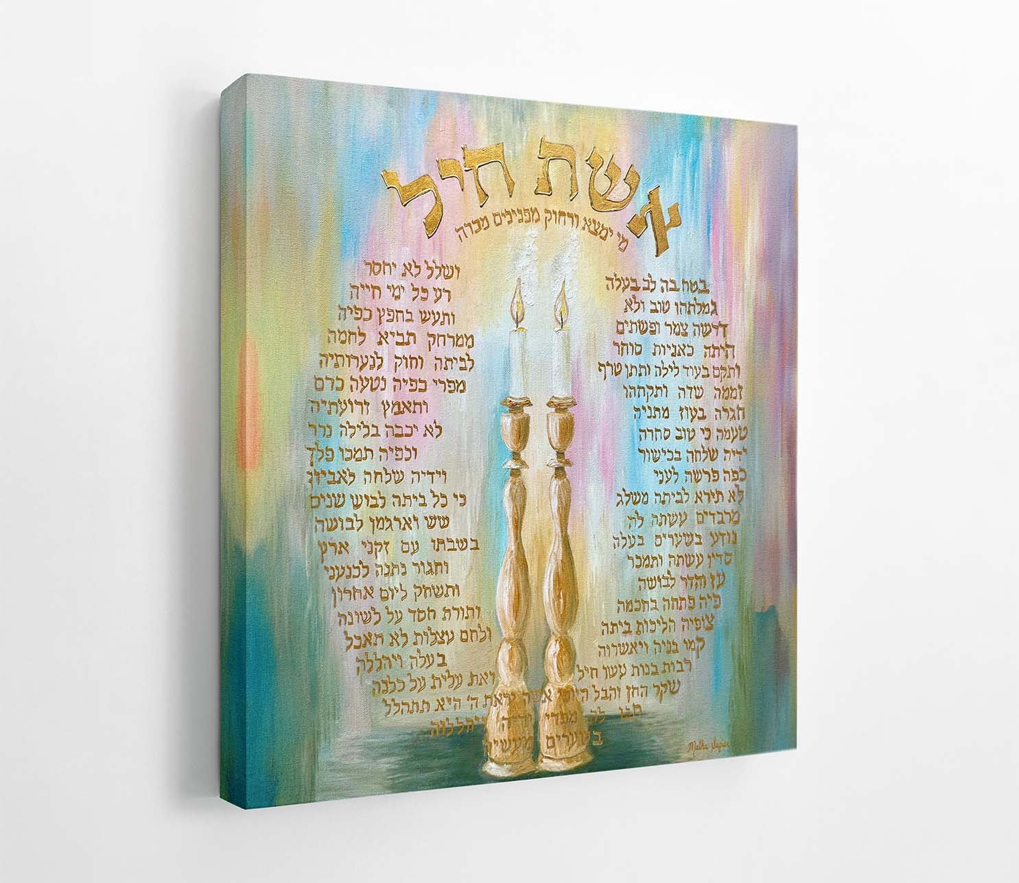 Eshes Chayil is a celebration of the Jewish woman. This painting combines the beauty of an artwork with the timeless words of the Eshes Chayil prayer written elegantly around it. At the center, glowing candlesticks symbolize one of the most cherished mitzvot of Jewish women—the lighting of Shabbat candles. The Shabbat candles illuminate not only the home but the soul of the family, bringing warmth, peace, and spiritual light into daily life. In this painting, the light of the candles is intertwined with the virtues described in Eshes Chayil, reflecting a woman’s strength, wisdom, and nurturing presence. Eshes Chayil honors how a woman’s dedication, faith, and mitzvot create a sacred home, full of bracha, embodying the living prayer of “woman of valor.”