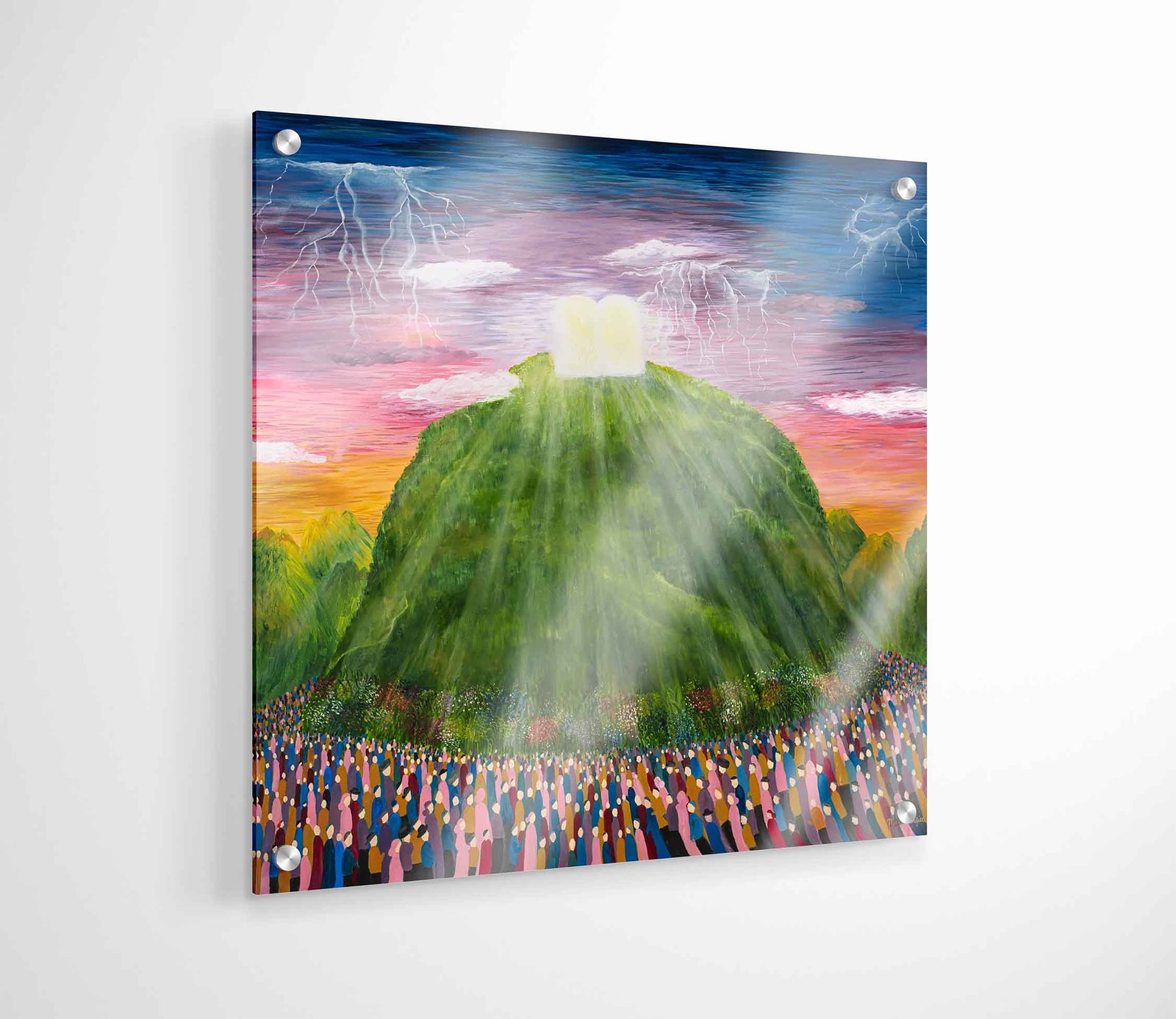The Jewish people stand in sacred stillness at Har Sinai, poised between heaven and earth. The painting invites the viewer into that breathless pause before destiny unfolds. It captures the forging of an eternal covenant, evoking both humility and purpose, and reminds us how that revelation continues to echo within every generation.