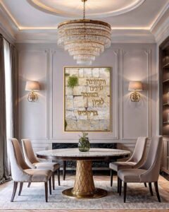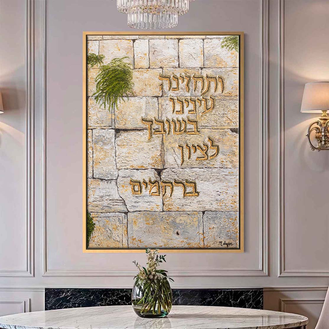 Prayer etched in stone captures the Kosel with striking realism, inviting the viewer into the weight, texture, and timeless presence of its stones. Carved into the wall are the words, “May our eyes see the return to Zion with mercy,” transforming the Kosel into both a place of prayer and a voice of prayer. The etched words represent the countless tefillos whispered here over centuries—prayers shaped by tears, longing, and hope. They also suggest the voice of the Kosel itself. Once part of the Beis HaMikdash, the Wall now stands in quiet solitude, bearing the absence of Hashem’s revealed Presence and yearning for its return. The carvings imply that generations of faith and pain have pressed so deeply into this sacred place that they have permanently marked the stones. Through this, the painting presents the Kosel as both witness and participant—holding the prayers of a nation while expressing an unbroken longing for redemption, mercy, and the rebuilding of Hashem’s holy home.