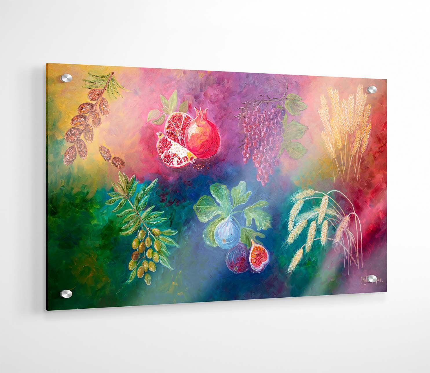 Rich, vibrant fruits fill the canvas with beauty and symbolism. The painting invites the viewer to reflect on how each fruit mirrors a quality within Am Yisrael — resilience, sweetness, humility, and light. It conveys the enduring bond between the Jewish people and the Land, where physical bounty reflects spiritual depth.